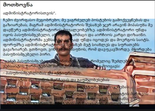 | მოთხოვნა ადმინისტრატორისთვის". ჩემო ძვირფასო მეგობრებო, მე ვაგრძელებ პოსტების გამოქვეყნებას და გაზიარებას, მაგრამ ადმინისტრატორის შესახებ ჯერ არავინ მიპასუხა მე დავწ ერე ადმინისტრატორის მოვალეობებზე. ადმინისტრატორი უნდა იყოს პასუხისმგებელი, არ იყოს ზარმაცი და აირჩიოს კარგი დიზაინი. ადმინისტრატორმა ვებსაიტი კარგად უნდა იცოდეს და მოერგოს საიტს. ფორუმზე ადმინისტრატორის შესახებ მეტ სიახლეს და სურათებს გავაზიარებ. გთხოვთ, ვინმემ მიპასუხოს, რომ დავუკავშირდე. მჭირდება პასუხისმგებელი პირი. "ვეძებ პასუხისმგებელ ადმინისტრატორს, რომელიც შეძლებს ჩემი ვებსაიტის წარმატებით მართვას. მოვალეობები მოიცავს: - პასუხისმგებლობას და აქტიურობას - ვებსაიტის დიზაინის შერჩევას და გაუმჯობესებას - ვებსაიტის კარგად ცოდნას და მის ეფექტურად გამოყენებას თუ ხართ პასუხისმგებელი, კრეატიული და გაქვთ ვებსაიტის მართვის გამოცდილება, გთხოვთ, დამიკავშირდით. მე ვეძებ ადამიანს, ვინც შეძლებს ჩემს გვერდს წარმატებისკენ წაიყვანოს. მადლობა!" „ადმინისტრატორის მოთხოვნა ძვირფასო მეგობრებო, გიკავშირდებით, რადგან ჯერ კიდევ მჭირდება პასუხისმგებელი და თავდადებული ადმინისტრატორი ჩემი ვებსაიტისთვის. ჩემი წინა პოსტების მიუხედავად, არ მიმიღია არცერთი პასუხი, რომელიც აკმაყოფილებს ჩემს მოლოდინებს. შეგახსენებთ, რომ ადმინისტრატორის მოვალეობები მოიცავს: - ვებსაიტის მუდმივად განახლებული და გამართული მუშაობის უზრუნველყოფა - ვიზუალურად მიმზიდველი დიზაინის შერჩევა და დანერგვა, რომელიც შეესაბამება ჩემს ბრენდს - ვებსაიტის ფუნქციონალურობის ღრმა გაგება და საჭიროების შემთხვევაში გაუმჯობესების შეტანა თუ თქვენ ხართ მოტივირებული და კრეატიული ადამიანი, რომელსაც აქვს ვებსაიტის მართვის გამოცდილება, სიამოვნებით მოგისმენთ. ჩემი იდეალური კანდიდატი არის ადამიანი, რომელიც არის პროაქტიული, ყურადღებიანი და გატაცებულია მაღალი ხარისხის შედეგების მიწოდებით. როგორც ჩემი ვებსაიტის ადმინისტრატორი, თქვენ მნიშვნელოვან როლს შეასრულებთ მომხმარებლის გამოცდილების ჩამოყალიბებაში და დამეხმარებით ჩემი ონლაინ მიზნების მიღწევაში. თუ მზად ხართ გამოწვევისთვის და გჯერათ, რომ გაქვთ ყველაფერი, რაც საჭიროა ჩემი გვერდის წარმატების მისაღწევად, გთხოვთ, ნუ მოგერიდებათ დამიკავშირდეთ. მოუთმენლად ველი თქვენგან კითხვებს ვ ისმენ და განვიხილავ, თუ როგორ შეგვიძლია ერთად ვიმუშაოთ ჩემი ვებსაიტის ახალ დონეზე ასაყვანად . გმადლობთ!